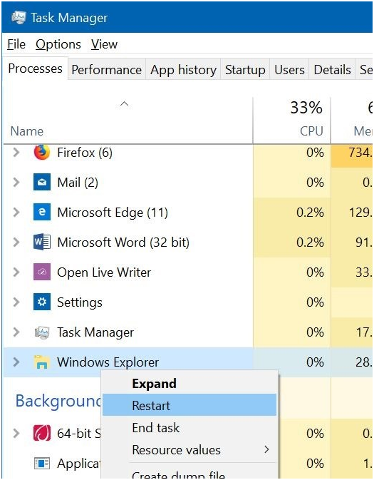 - And Scroll down to find the Windows Explorer. Right click on it and click ‘Restart’.