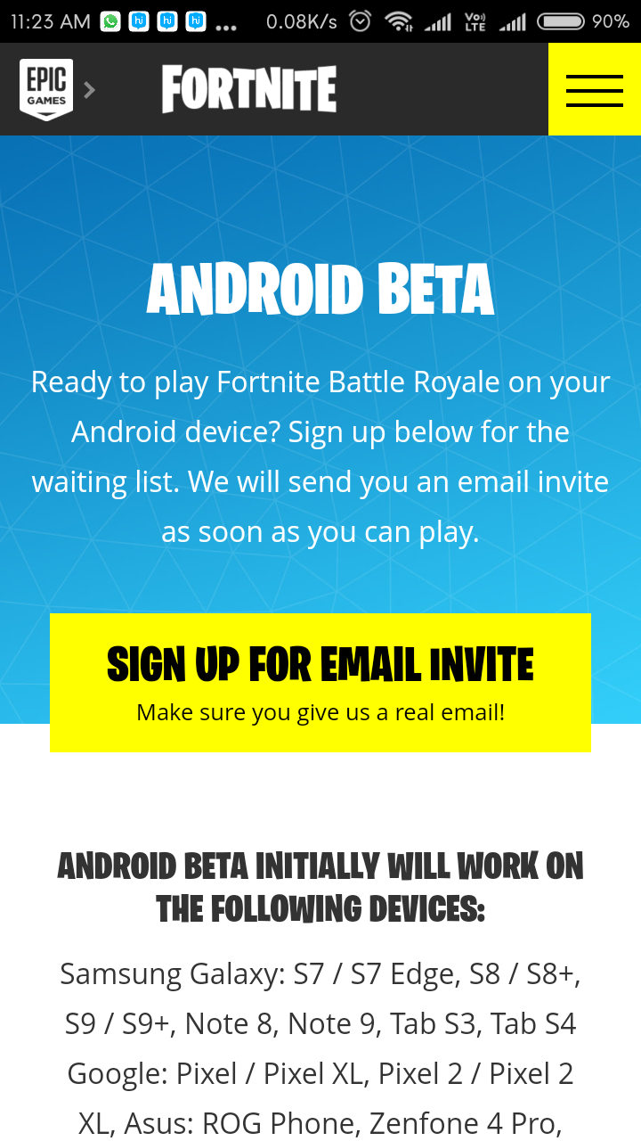 If the Fortnite beta is available for your device then you can get the Fortnite APK installer link at the time. In a case, if you can’t see it, then you will have to tap the ‘Sign up for Email Invite’ so that Epic Games team will send the Fortnite APK link once it available for your Android phone after August 12th.