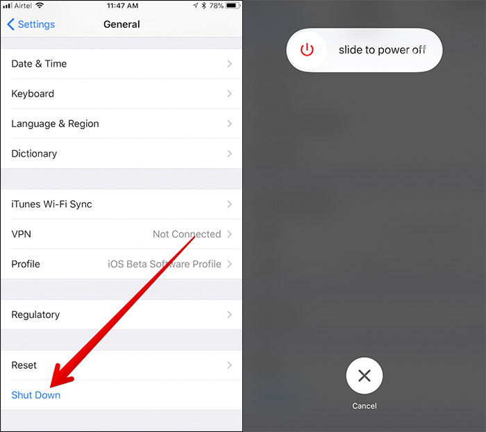 Step 2: Now, scroll down and tap on Shut Down → Swipe the slider to the right.