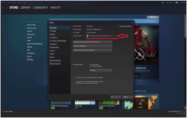 After you entered the settings make sure that steam guard is activated because if this is not activated then you are not going to be share games with your family and friends.