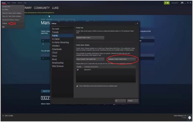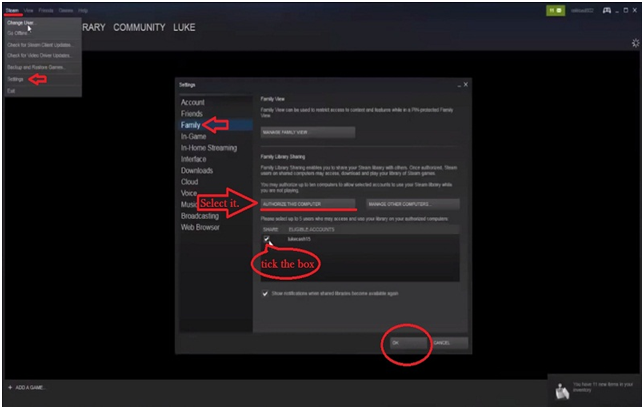 Here in settings page go to the family option as you can see in the screenshot, in family view check on the share eligible account button and then click to authorized this computer button to share your games with others and then press ok button.