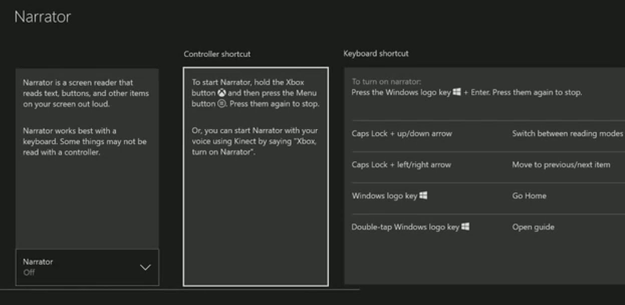 - First Xbox One narrator can be turned on by just pressing the Windows key and enter simultaneously on the keyboard.