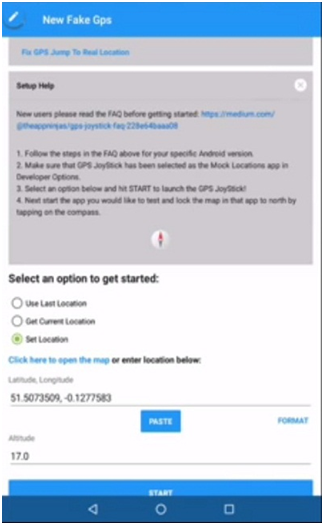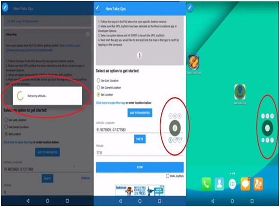 Create a shortcut of New Fake GPS at the desktop screen of your device and open it, now the red error is removed and as you select the set location option you will get all the details below filled as it was not shown before in step 4.